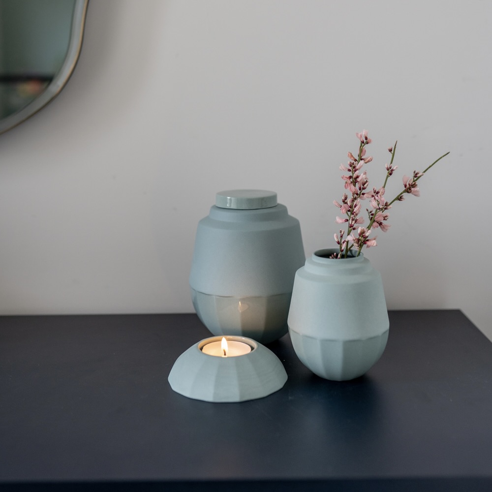 Met het gedenkplekje mint creëer je een intieme en warme herinneringsplek in huis. De kleine urn Kuma vormt samen met vaasje Maia en waxinelicht Meissa een harmonieus geheel. Het is een liefdevol samengesteld gedenkplekje in huis, waar je even kunt stilstaan, een kaarsje kunt branden en bloemen een betekenisvolle plek kunt geven. Zo ontstaat er een rustgevend plekje vol troost en herinnering.