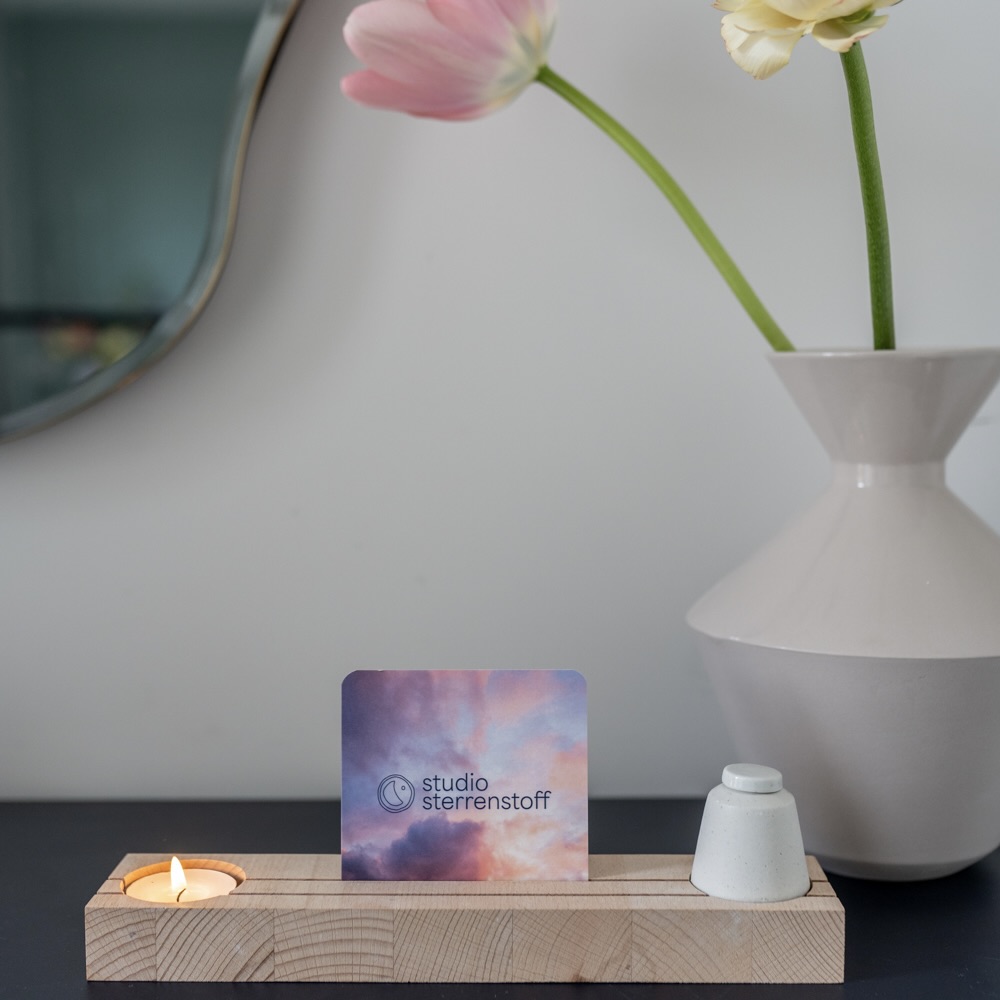 Het langere plankje biedt ruimte aan drie elementen: het mini urntje, een waxinelichtje en een kaart of foto. In het midden kun je een persoonlijk kaartje plaatsen, zoals een rouwkaart, een handgeschreven boodschap of een echofoto van een stilgeboren baby. Zo ontstaat een gedenkplekje waarin beeld, licht en herinnering samenkomen.