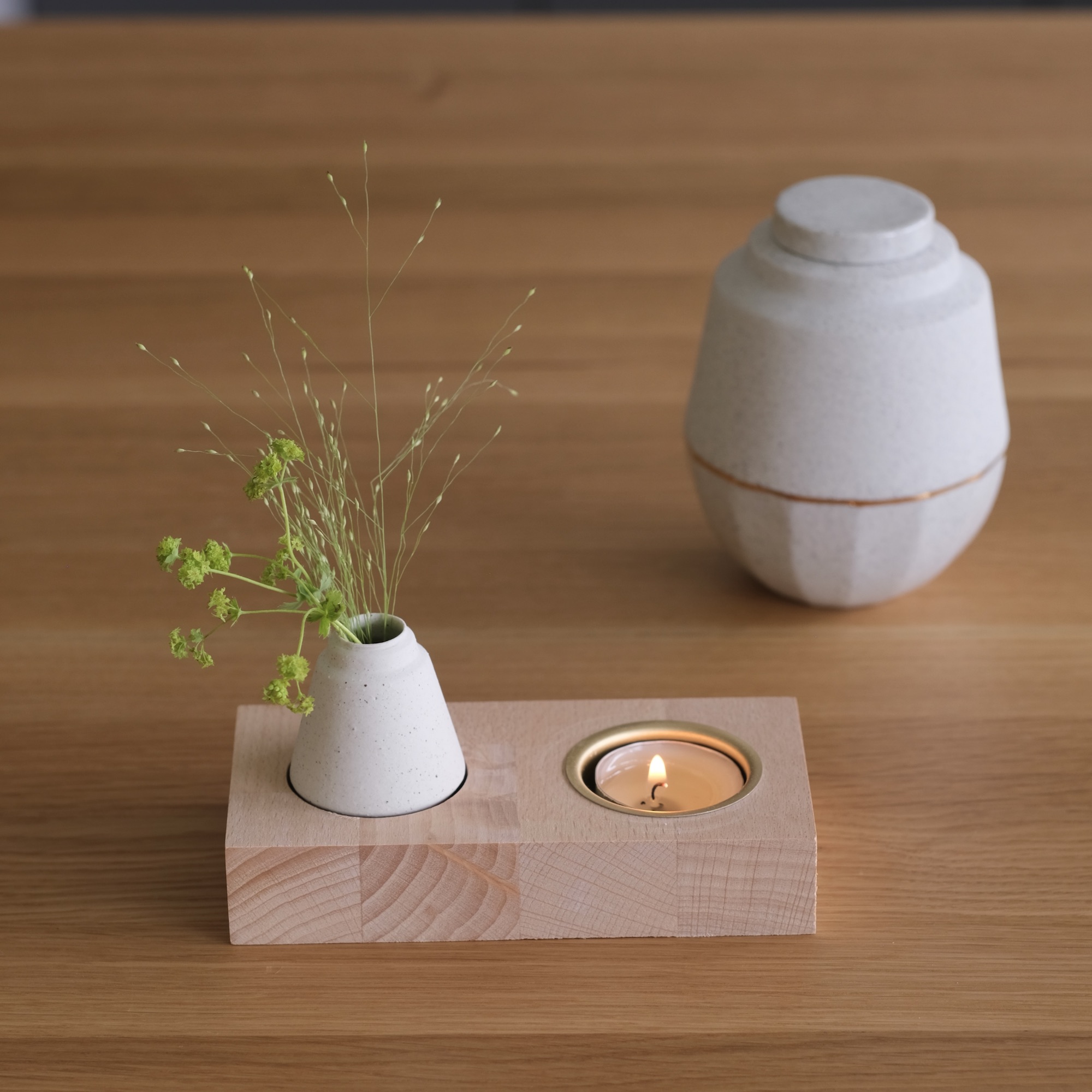 Dit handgemaakte mini vaasje staat subtiel in een stijlvol houten houdertje. Plaats een bloempje of steek een kaarsje aan voor een warme, persoonlijke touch. Een mooie aanvulling op een urn of als liefdevol gedenkhoekje op zichzelf.